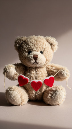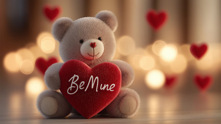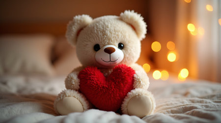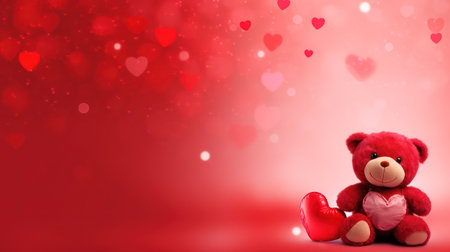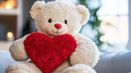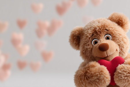 Cute bear holding red heart against soft heart-shaped background for romantic occasions and celebrations