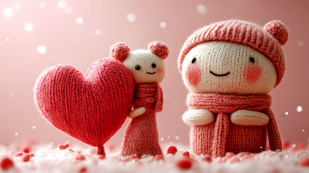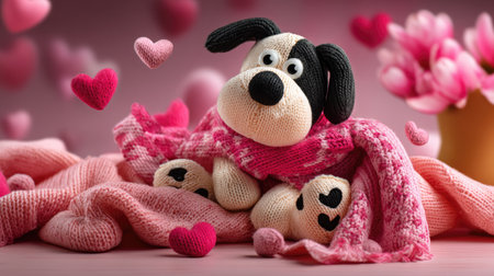 A delightful knitted dog toy sits surrounded by pink hearts and a cozy scarf, creating a charming and heartwarming atmosphere perfect for decor.