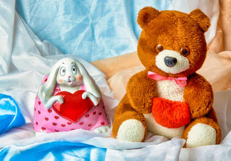A teddy bear with a red heart in his hands, and a bunny with a heart in his hands on a colored holiday background with place for text. Valentine's Day. Postcard.8 March