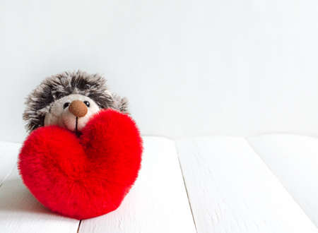 Hedgehog toy and red soft heart on a white wooden background for valentine day with copy space