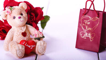 Happy Valentine's Day with sweet bear, gift and white background and hearts in love