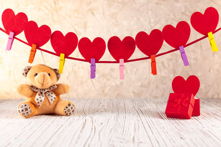 on the white brushed wooden surface sits a teddy bear and stands a red gift box with a red heart, at the top of the frame on the ribbon hang red hearts on the clothespins
