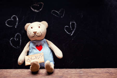 Teddy bear, LOVE letters, heart on wooden background. Place for text. The concept to St. Valentine.