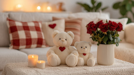A beautifully decorated living room for Valentine's Day featuring teddy bears, vibrant roses, and cozy lighting, creating an inviting and romantic atmosphere.
