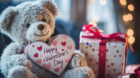 A close-up of a teddy bear holding a Happy Valentine's Day heart, sitting next to a wrapped present.