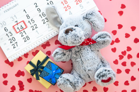 Calendar with 14 february date, soft toy and gift on pink background, flat lay, valentine's day concept.