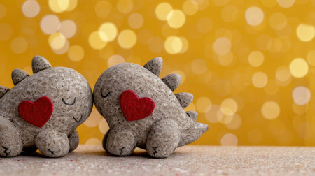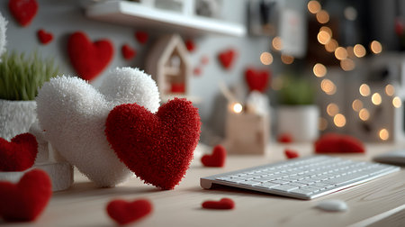 A cozy and romantic workspace adorned with plush heart decorations in red and white, ideal for valentine's day themes. a sleek keyboard sits on a wooden desk illuminated by warm bokeh lights, creating an inviting and inspirational setting. Generative AI