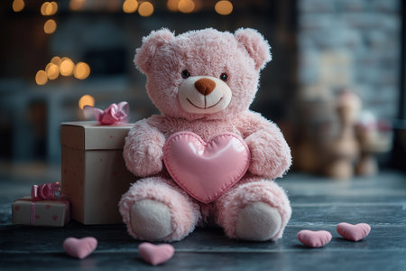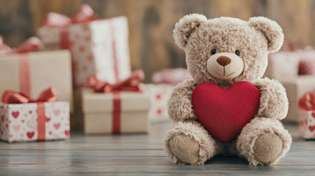 A cute teddy bear with a heart sits among beautifully wrapped gifts, creating a warm and festive atmosphere perfect for celebrations.
