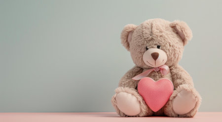 A fluffy teddy bear sits on a surface, cradling a soft pink heart. The backdrop features a gentle gradient of pastel colors, creating a warm and inviting atmosphere, perfect for conveying love and affection.