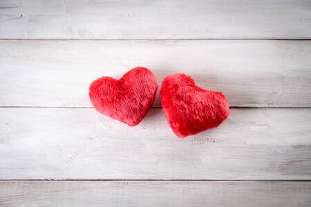 Two toy red hearts on white fur background with copy space for text, symbol of love, healtcare, valentines day concept