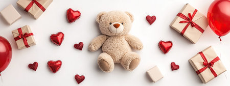 Teddy bear surrounded by heart shaped balloons and gift boxes on a white background