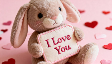 A closeup of a stuffed bunny with an I Love You sign: detailed fabric texture and embroidery on a soft pink background with confetti hearts. A romantic Valentine's Day concept.
