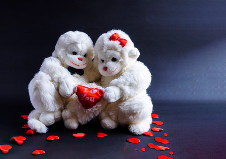 Soft toy monkeys holding a heart on a black background. A symbol of love. valentine's day
