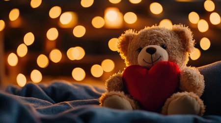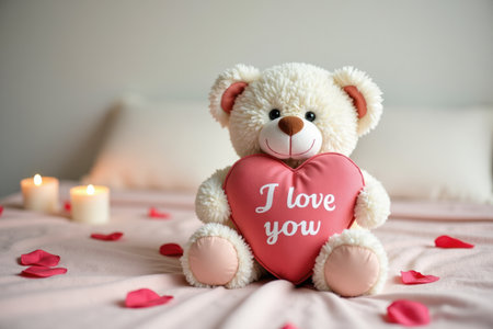 A cute teddy bear holding a heart-shaped pillow with I love you written on it. The bear sits on a soft blanket on a bed surrounded by rose petals and candles. Minimalist Interior Style.