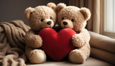 Two fluffy teddy bears sitting on sofa holding red heart pillow. Cozy blanket and window light create a warm romantic atmosphere at home.