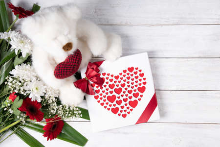 Valentines day gift, teddy bear with a heart, a box of pralines and a bouquet