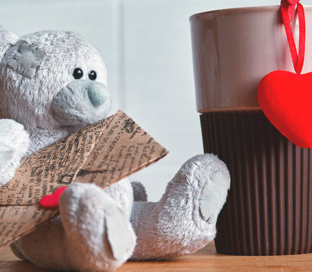teddy bear and big cup with red heart on a wooden table in Valentines Day. Teddy bear with the envelope