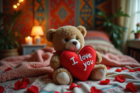 A cute teddy bear holding a heart-shaped pillow with I love you written on it. The bear sits on a soft blanket on a bed surrounded by rose petals and candles. Bohemian Interior Style.