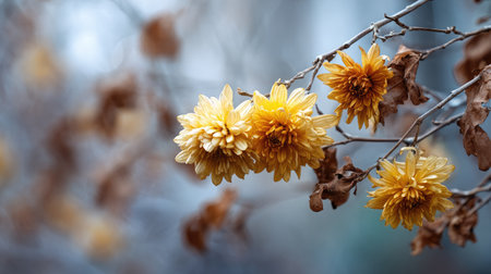 The Garland chrysanthemum in winter, chilling air envelops, a few lingering leaves tremble, still atmosphere