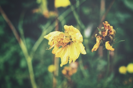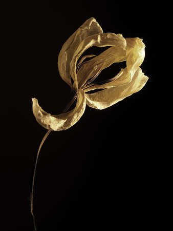 Old withered yellow tulip on a dark background, Past beauty with abstract fragility