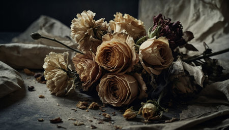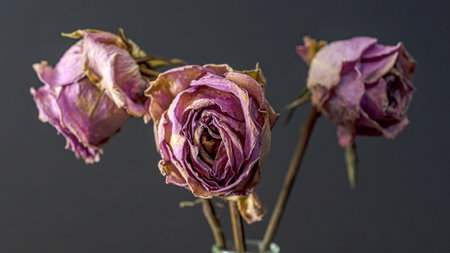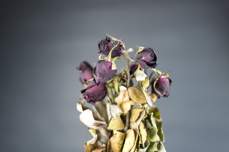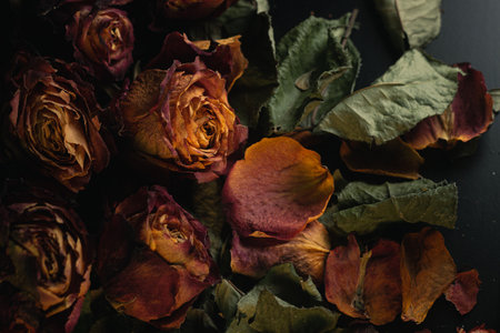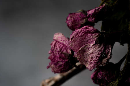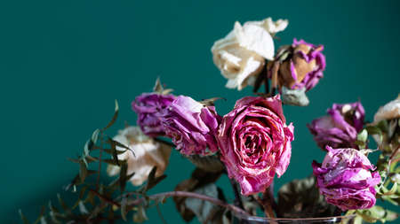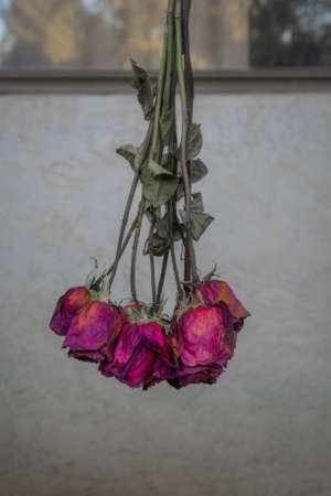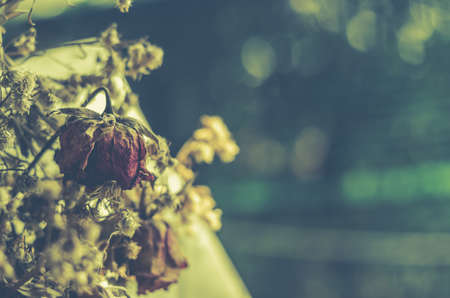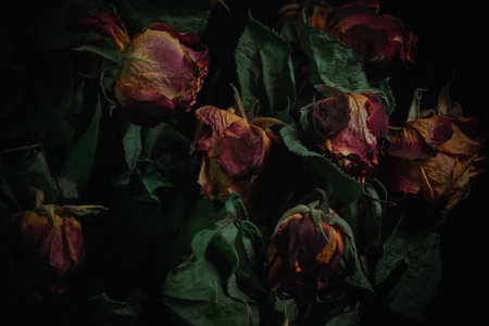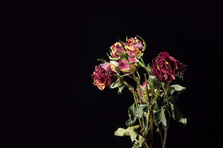 Bouquet of dried roses on dark background, dried out flowers, retro vintage style photo, death concept
