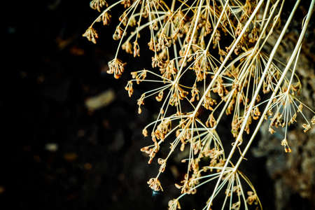Bell shape brown dry little romantic flowers branch on light background with lovely orange vintage effect macro