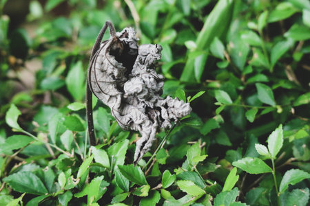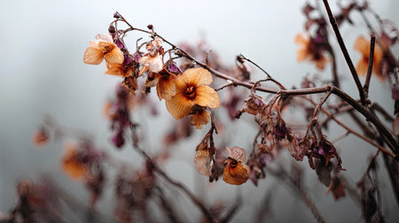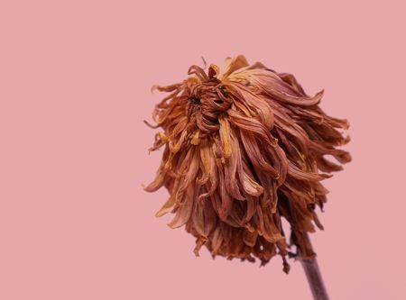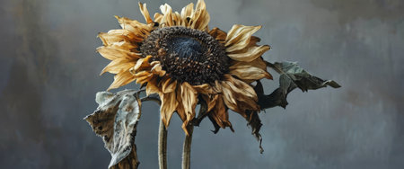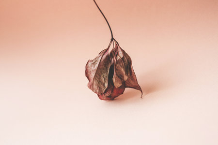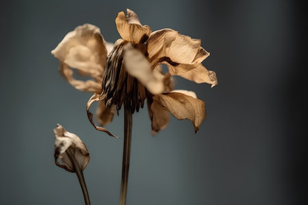 Isolated dead flower with drooping stem and faded hues on a plain background, symbolizing fragility and natural cycles