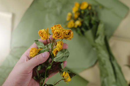 Close-up of a man's hand holding dried yellow flowers. A fading bouquet of yellow roses. selective focus.