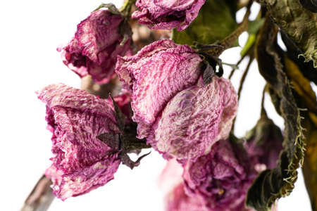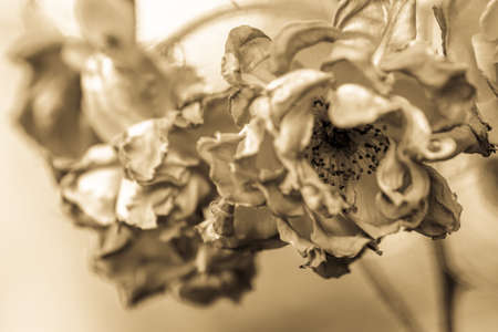 Dry roses. Close-up black and white image of dried rose flowers in a bouquet. Life and death concept. Withered flowers