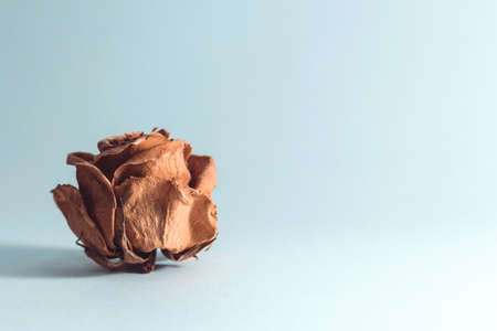 One single withered dry red rose lie on a beige background. Top view floral composition. Copy space