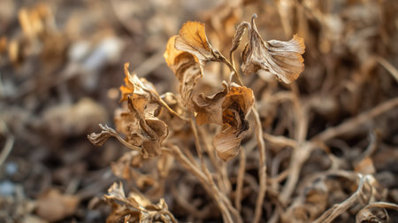 Withered leaves and flowers drooping from lack of water, showcasing the delicate balance of nature disrupted by drought
