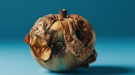 Old dried apple on a blue minimal background. Spoiled and shriveled fruits. Generative Ai