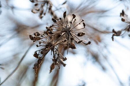 dry Apiaceae or Umbelliferae family plant close-up shallow focus bottom view on clear light blue sky background