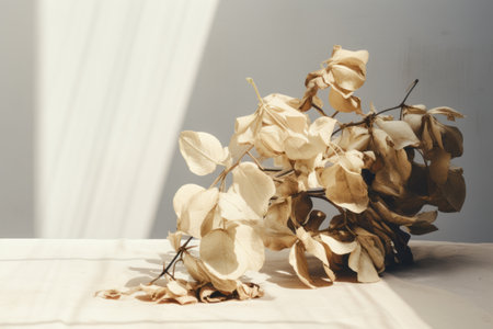 Blooming Contrasts: An Aesthetic Harmony of Withered Blossoms and Lush Leaves on a White Table