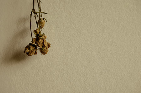 Bouquet of red dry withered roses on a beige background. Floral composition