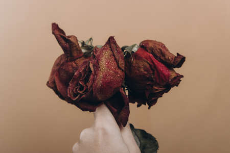 Female hand holds bouquet of red dry withered roses on a beige background. Floral composition