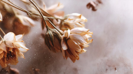 A stunning close-up image of wilted flowers showcasing delicate petals and soft colors. The photograph highlights the beauty of nature's fleeting moments and transformation.