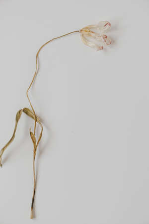 White dry tulip flower on white background. Beautiful composition with neutral colors. Minimal, stylish, trend concept. Parisian vibes. Closeup photo.
