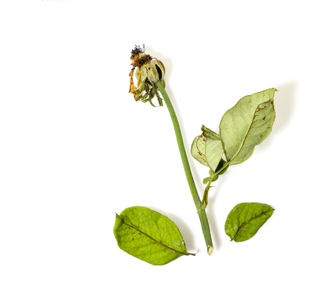 close up of a faded flower rose with leaves on a white background sharpness in the foreground