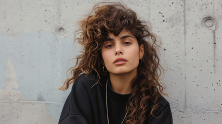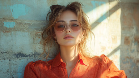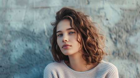 A young woman with wavy hair stands against a textured wall showcasing a confident expression. The warm light highlights her features capturing the essence of urban beauty at sunset.