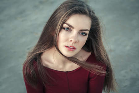 Fashion lifestyle, Portrait of the beautiful girl close-up with amazing eyes. Woman on the beach at sunset.