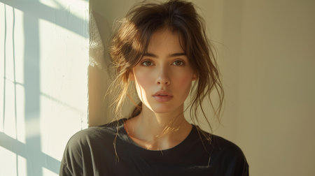 A young woman stands indoors with long hair. She looks directly at the viewer with a neutral expression. Sunlight enters through a nearby window, highlighting her features.