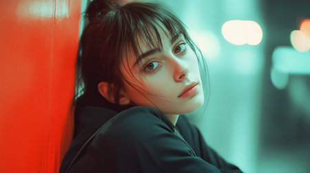 Young woman leaning against a vibrant wall in a dimly lit urban environment during the evening