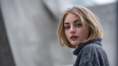 A young woman with blonde hair and green eyes, wearing a grey turtleneck sweater, looks directly at the camera with a neutral expression. The background is a blurred, neutral grey, suggesting an outdoor or minimalist indoor setting.