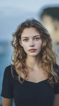 A young woman with wavy blonde hair and green eyes looks directly at the camera with a neutral expression. She is wearing a black top and is outdoors with a blurred background of the sea and a cliff.