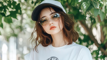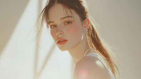 Confident beauty shot a young woman displaying clear underarms, minimalistic design, glowing skin, and bright background.