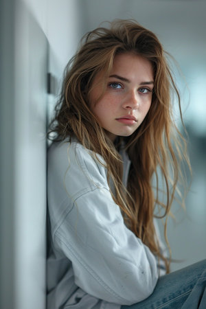 A young woman gazes thoughtfully at the camera, her hair softly framing her face, while leaning against a white wall illuminated by warm afternoon light.