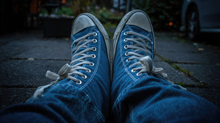 Selfie of a pair of blue sneakers on the ground, low angle view
