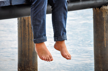 Bare feet hanging legs into the water on wooden pier