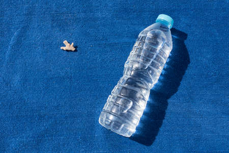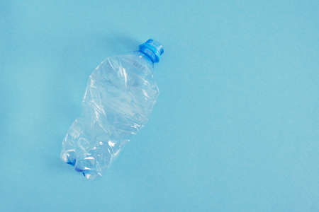 used plastic bottle on a blue background. The concept of using plastic. Top view, flat lay.